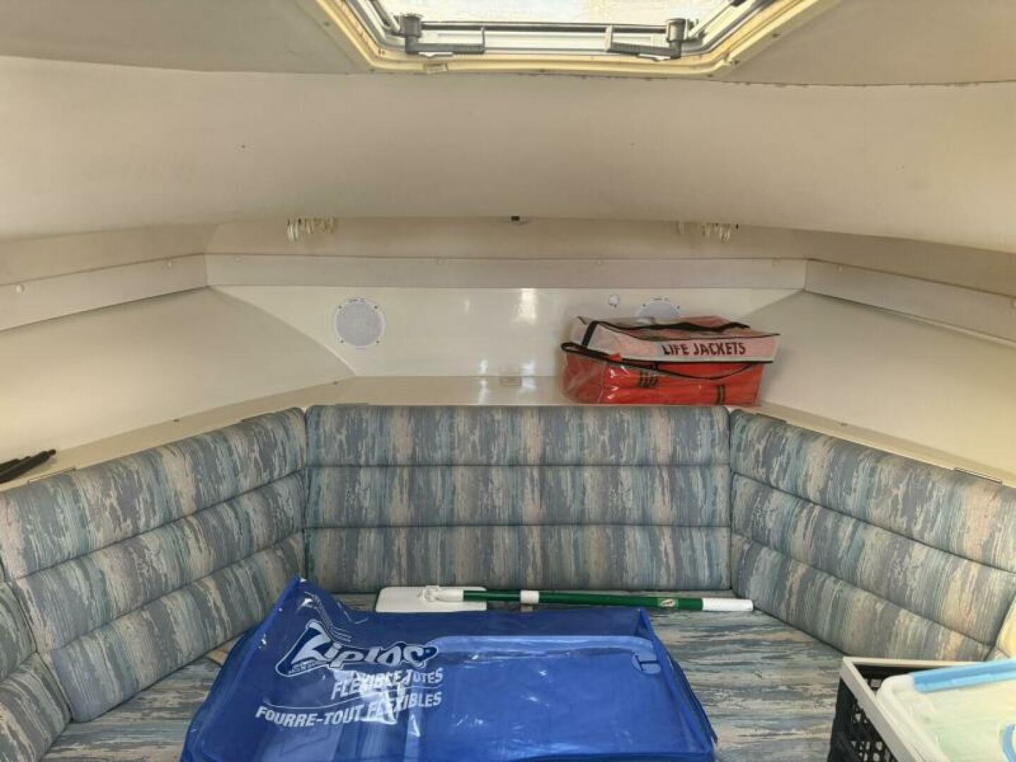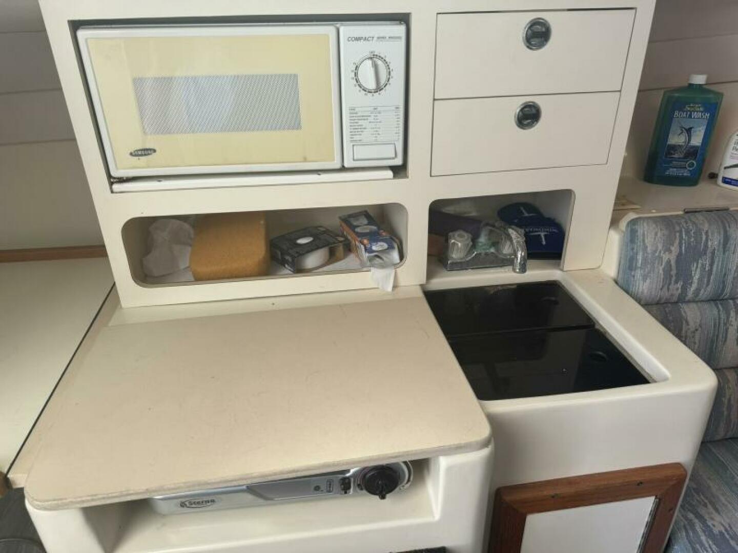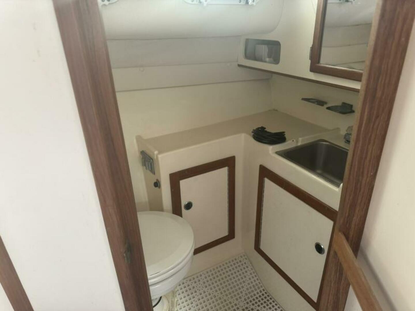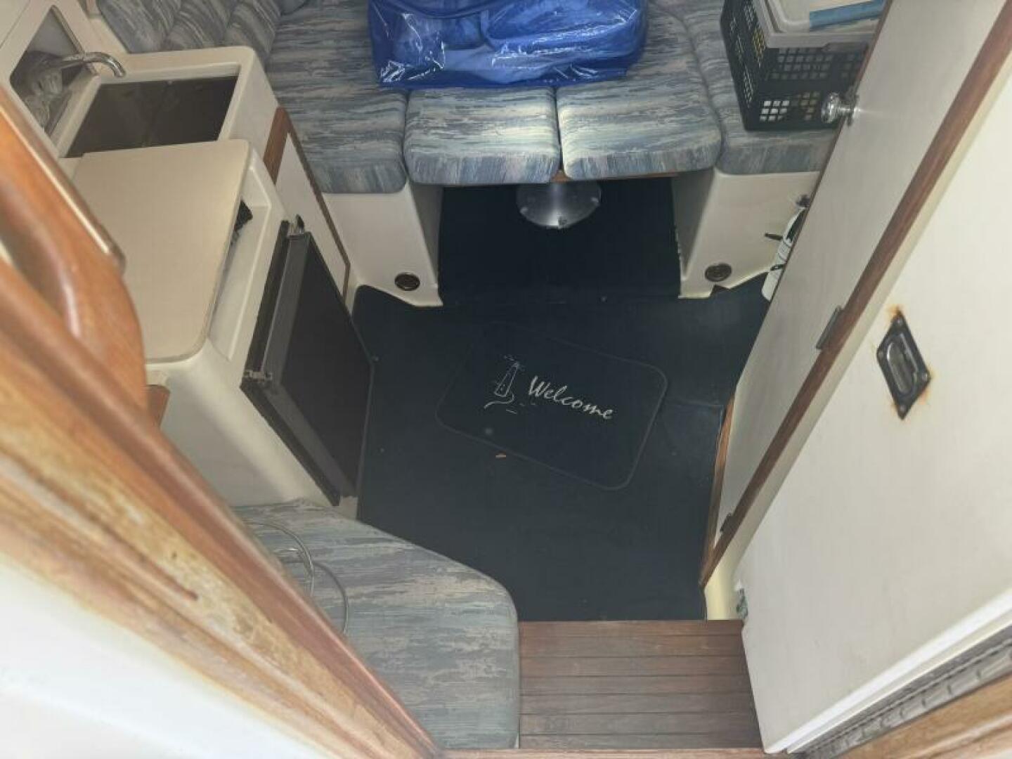 Below deck is a surprisingly roomy interior with the comforts of a larger vessel. With a full-service galley with fridge and microwave. Stand Up Head/Shower. Mid Cabin berth aft and a convertible U-Shaped dinette forward.