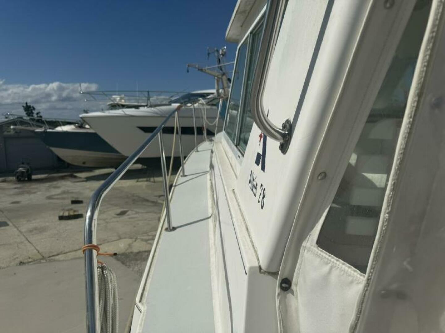 Albin 28TE ,Advertised as the Most Popular 28 Ft Cruiser Ever. Heavy built on a modified V Hull with a very wide beam for a 28 ft vessel. Prop protecting skeg keel. Cushioned Engine Box, surrounded by a large flush deck.