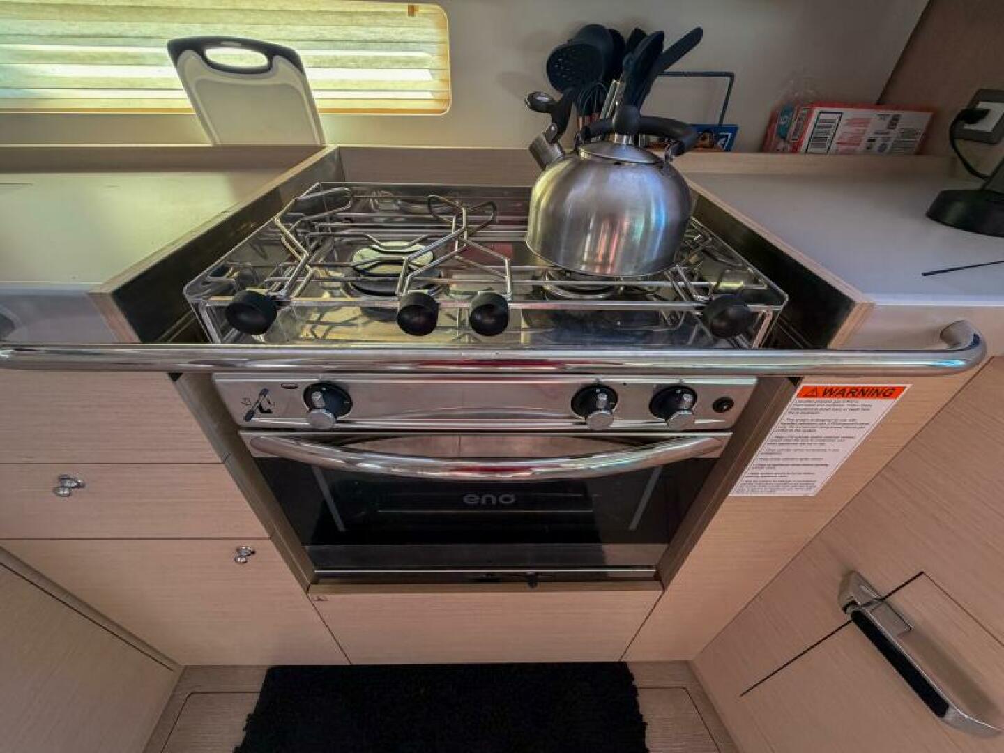 - Gimbaled propane 2-burner stove and oven with electric solenoid switch.