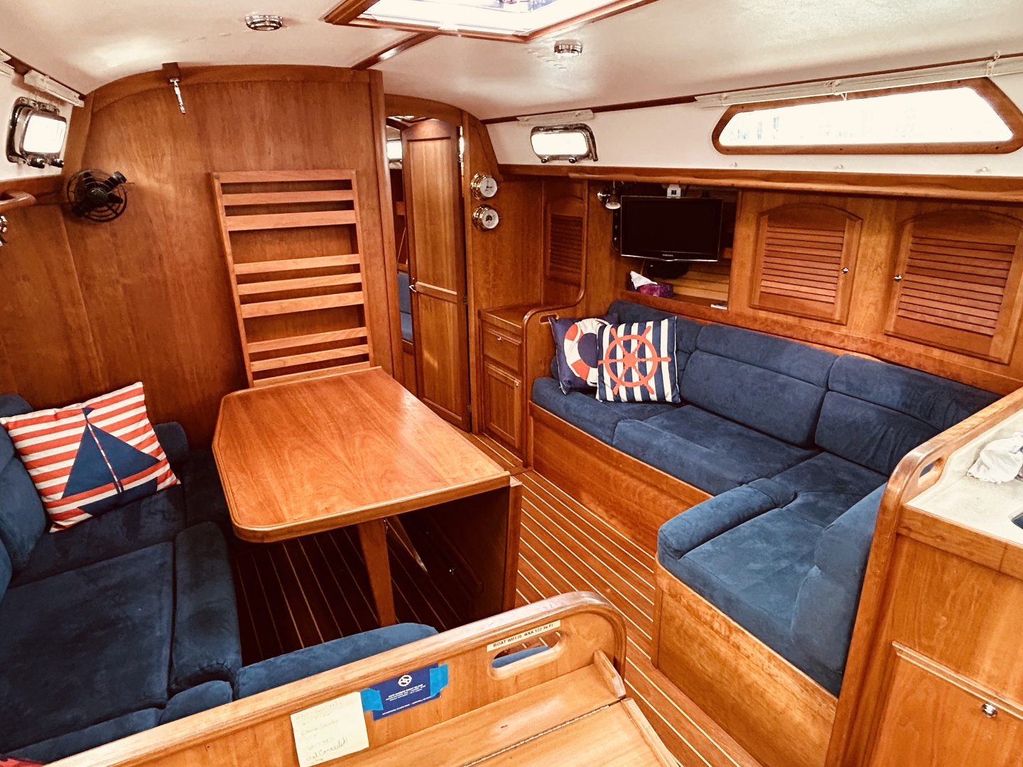 - The Main cabin has (2) 6' 6" L-shaped settee berths. The port berth converts to a double. The dining table folds up against the port bulkhead, freeing up space in the main cabin when not in use. Blue Ultra Suede Cushions.