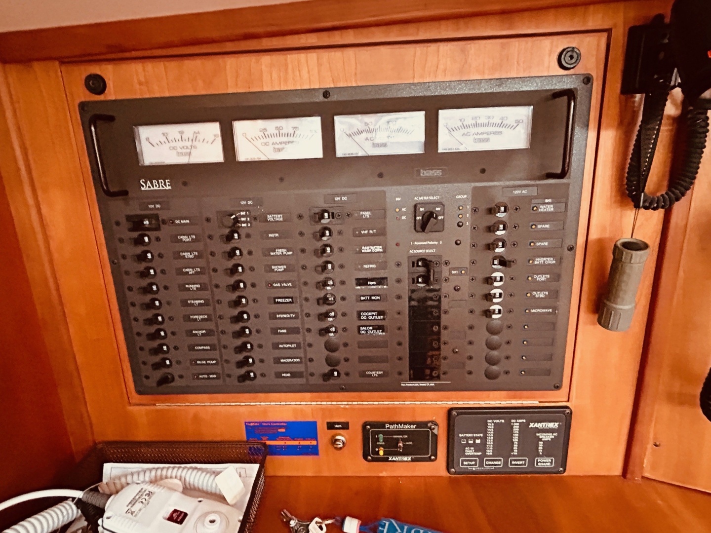 - Master AC/DC panels, located in the navigation area, include AC/DC volt and ammeters, marine circuit breakers, and polarity indicator