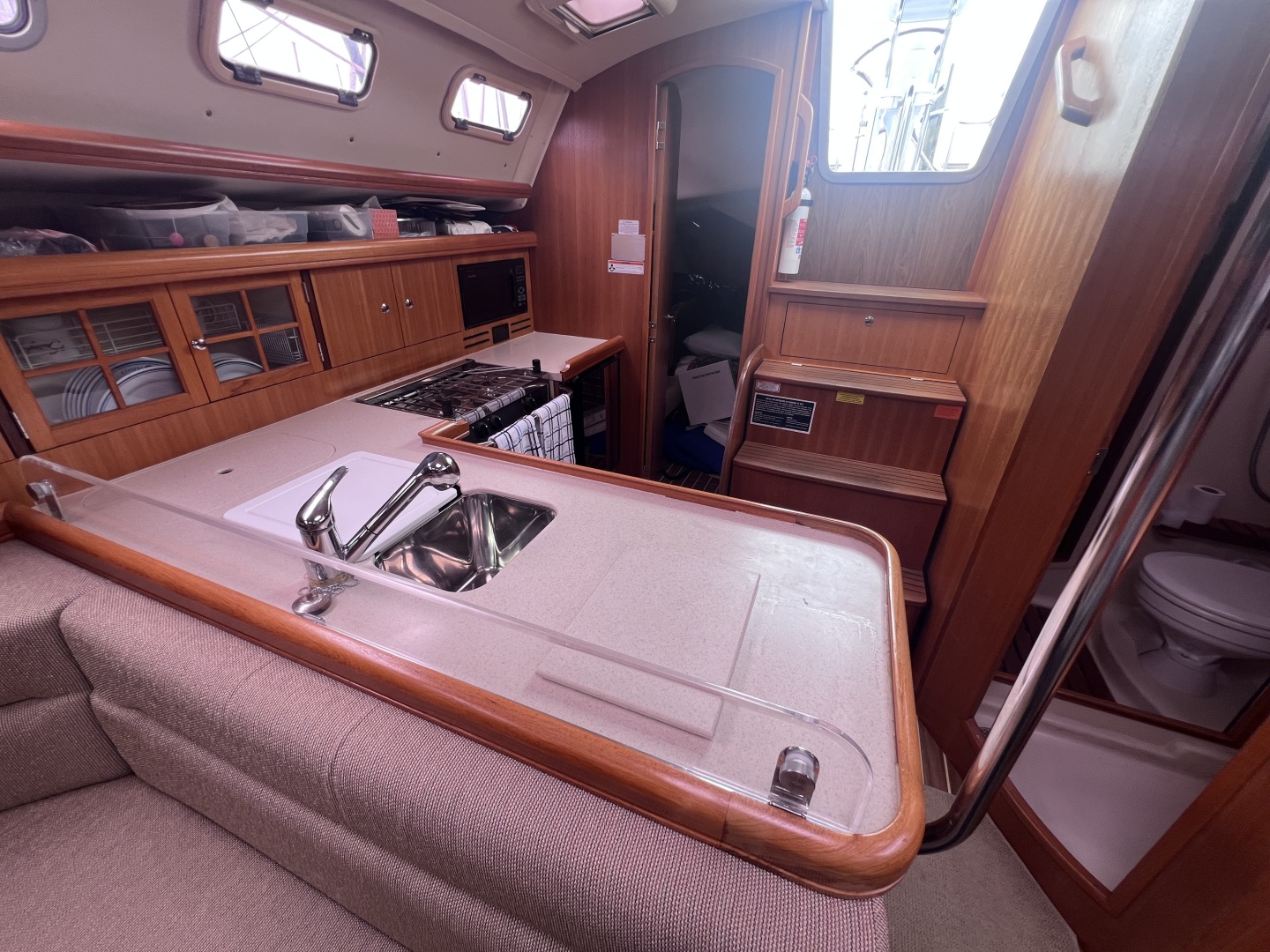 Step below, and you’ll find the warmth and practicality that make the Hunter 38 a favorite among PNW cruisers. The two-cabin layout offers a spacious owner’s cabin forward and a generous guest cabin aft, while the single head is efficiently designed with a separate shower stall – a true luxury after a rainy day on deck. The main salon is bright and airy, thanks to large hull ports, and the U-shaped galley provides ample counter space for preparing hot chowder or brewing that essential morning coffee. With good headroom throughout and smart storage for foul weather gear, provisions, and cruising guides, *Sound Affect* feels like a home that happens to float.