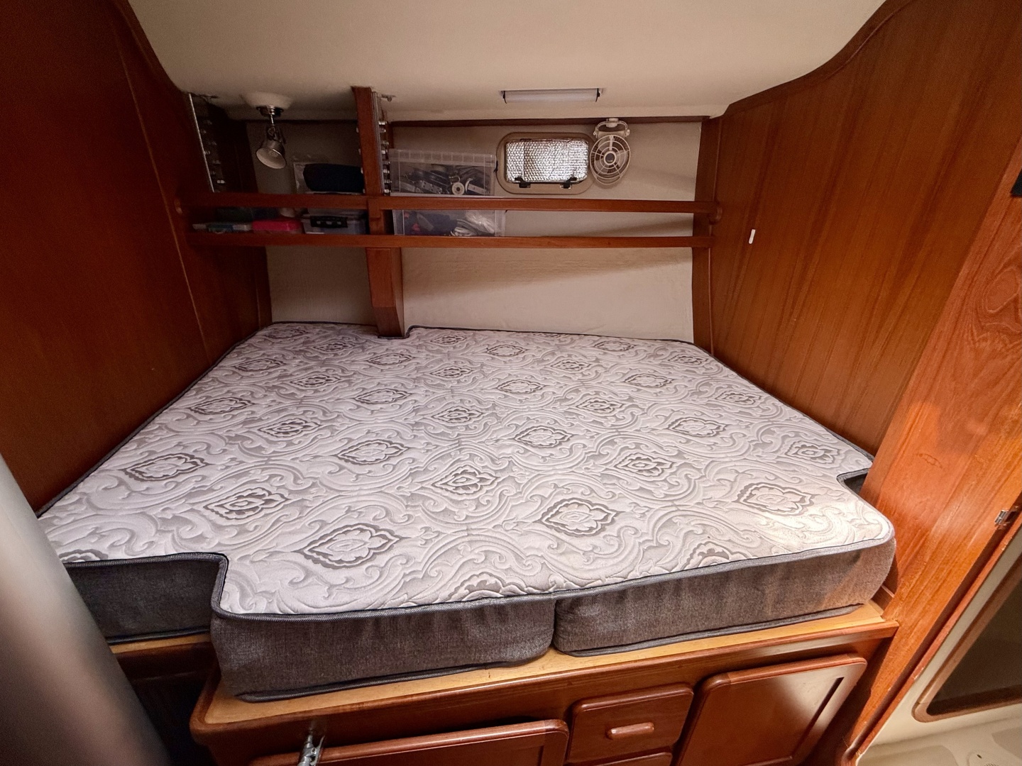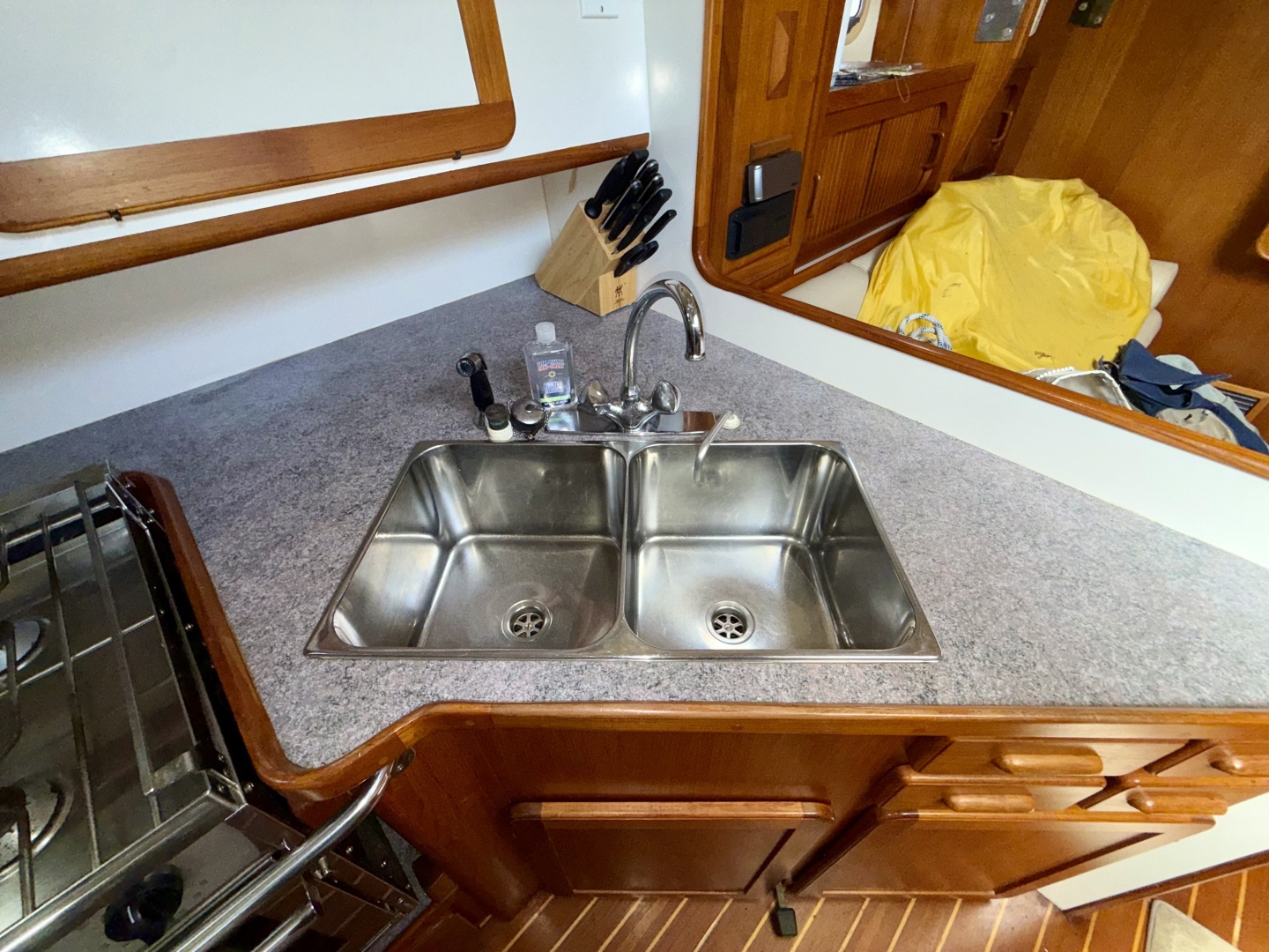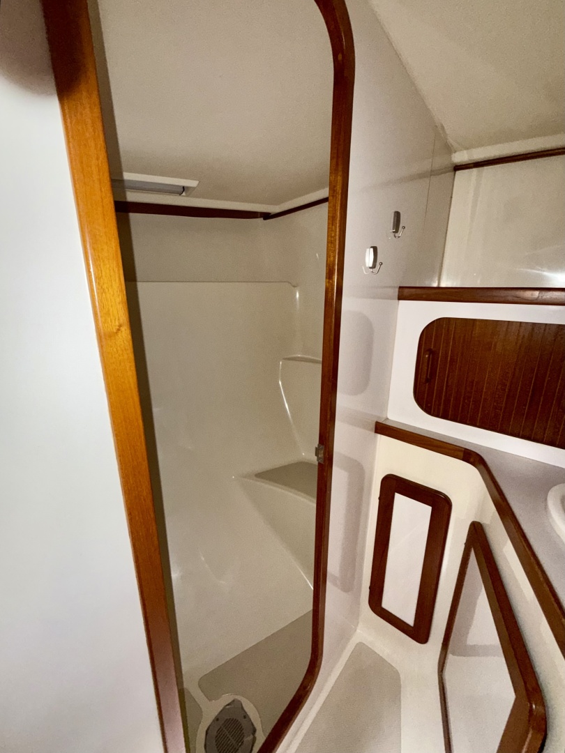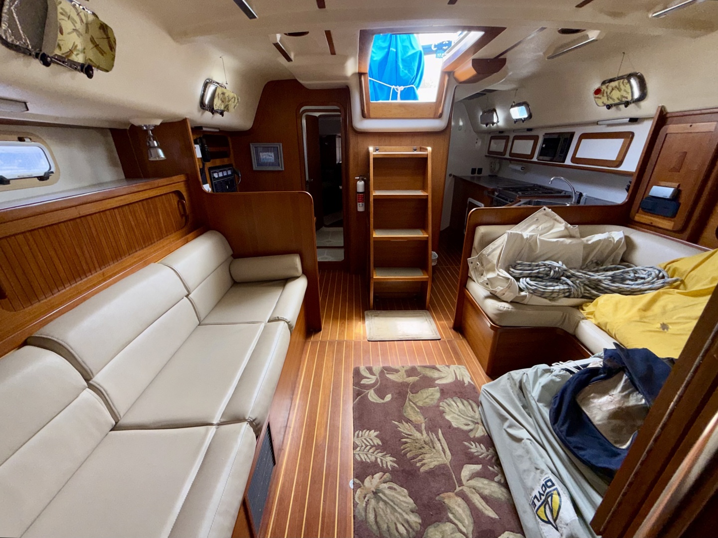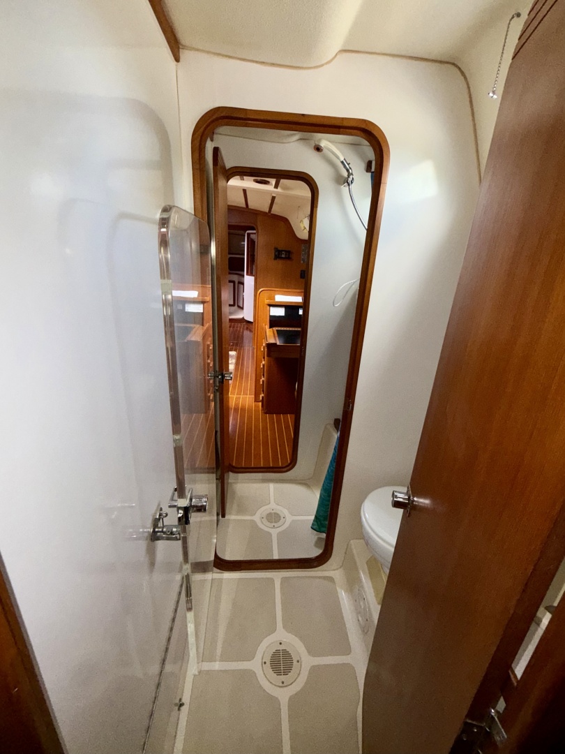 Luxurious accommodations in two staterooms, each with private head and separate shower, plus twin settees in the main salon that can convert to real sea berths. The port L settee is also convertible to a double. A large teak drop leaf table is bulkhead mounted to port. There is a dedicated nav station and excellent seagoing galley. All tanks are located below the sole, so storage is ample and accessible. Ventilation is superb through 18 opening ports, 4 overhead hatches, and Hella cabin fans. Teak and holly sole, navy blue upholstery, and varnished teak bulkheads enhance Surreal's ambiance.